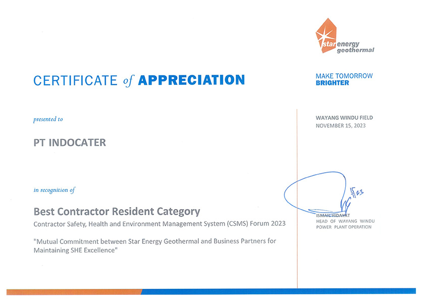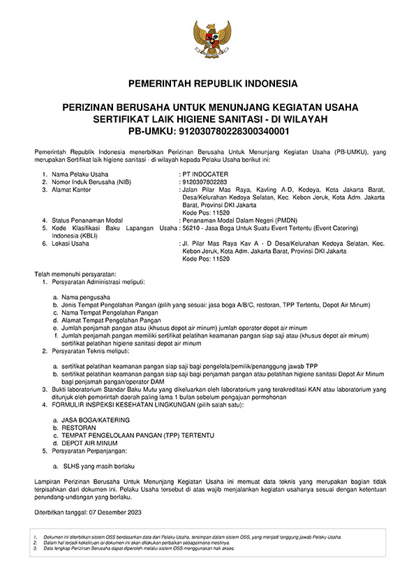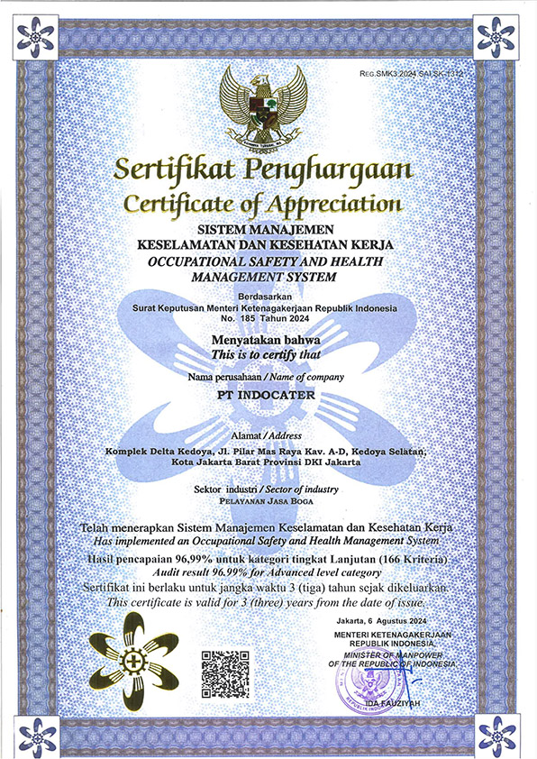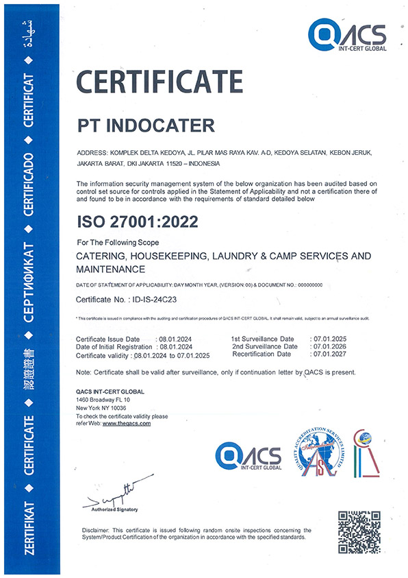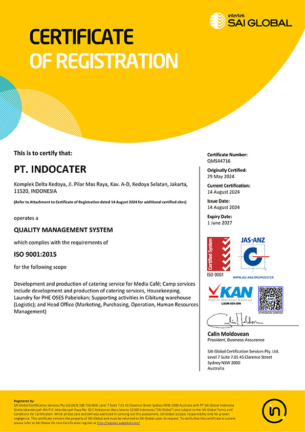 As one of the leaders in the Catering industry, we hold all international management and safety certificates required in the food industry , ISO 9001 : 2015 , ISO 22000 : 2018 , ISO 14001 : 2015 , HACCP ver 2020 , OHSAS 45001 : 2018 , ISO 37001 : 2016 , ISO 26000:2010, ISO 21502:2020 also HALAL certification from the Indonesian Council of Ulama and the SMK3 PP No.50 : 2012 from the Indonesian manpower department.